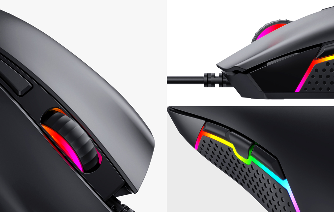 El producto impresiona no solo por su funcionalidad. El MS1010 está equipado con retroiluminación RGB de colores, lo que le da una sensación única al juego. El diseño moderno y elegante hace que el ratón tenga un aspecto increíble, puede ser una decoración fantástica para tu escritorio.