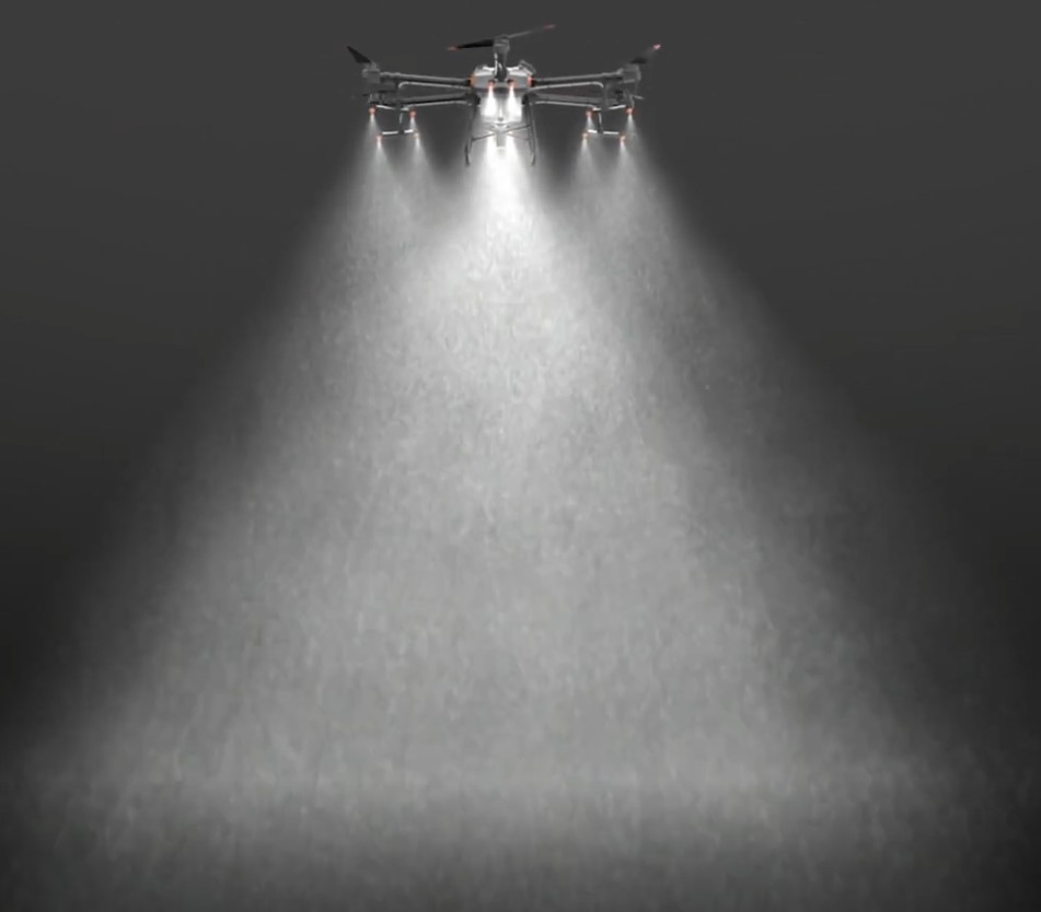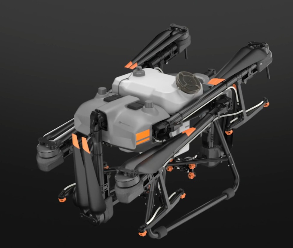 El DJI Agras T30 es un dron para agricultura con un depósito de 30 litros capaz de esparcir líquido en superficies de hasta 90Ha por día ya que es capaz de rociar en cada pasada hasta 9 metros de anchura gracias a la disposición de sus 16 boquillas y a la potencia de sus bombas capaz de impulsar 8 litros/min
