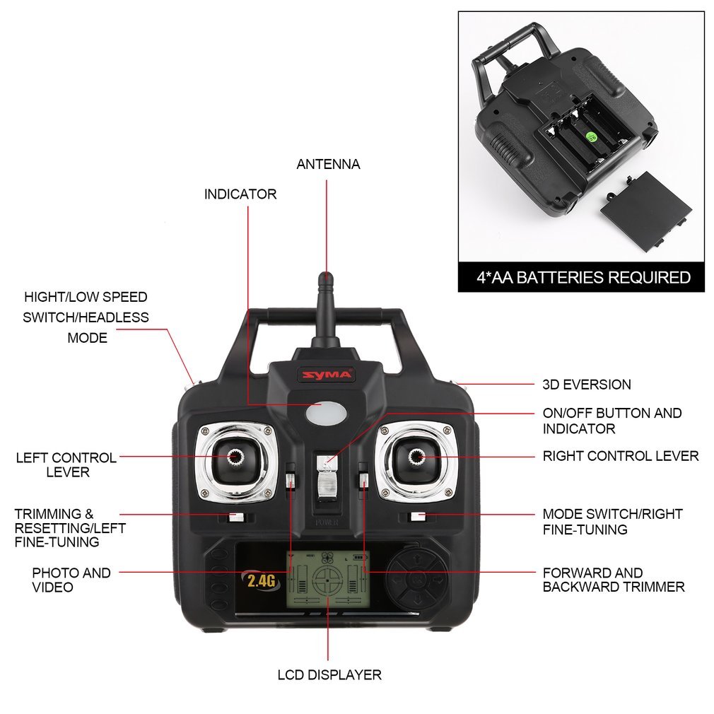 El innovador modo sin cabeza es una tecnología que facilita el control de los pilotos menos experimentados. Cuando el syma se dirige hacia nosotros, las direcciones de la inclinación del stick derecho corresponden exactamente a aquellas en las que se moverá el quadrocopter. Sin embargo, si lo giramos hacia adelante en nuestra dirección, el lado izquierdo cambiará con el derecho y el frente con la parte posterior. El modo sin cabeza significa que los controles seguirán siendo los mismos independientemente de la posición del dron.
